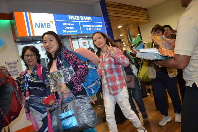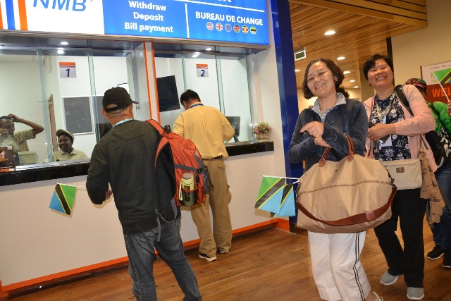 Watalii kutoka nchini China wakiondoka kwenye dirisha la Benki ya NMB baada ya kubadirisha fedha za kigeni kupitia Benki hiyo katika Uwanja wa Ndege wa Kimataifa wa Kilimanjaro muda mfupi baada ya watalii Zaidi ya 345 waliowasili nchini kutokea China juzi jioni. Benki ya NMB ni wadau wa ugeni huu na imedhamini mikutano yao wakiwa hapa nchini.