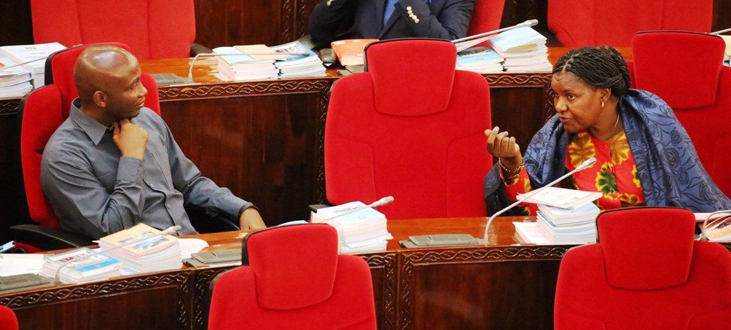 Naibu Waziri wa Ardhi Nyumba na Maendeleo ya Makazi mhe. Dkt Angelina Mabula akisisitiza jambo kwa Naibu Waziri wa Ofisi ya Makamu wa Rais Muungano na Mazingira mhe. Mussa Sima leo Bungeni Jijini Dodoma wakati wa kipindi cha maswali na majibu.