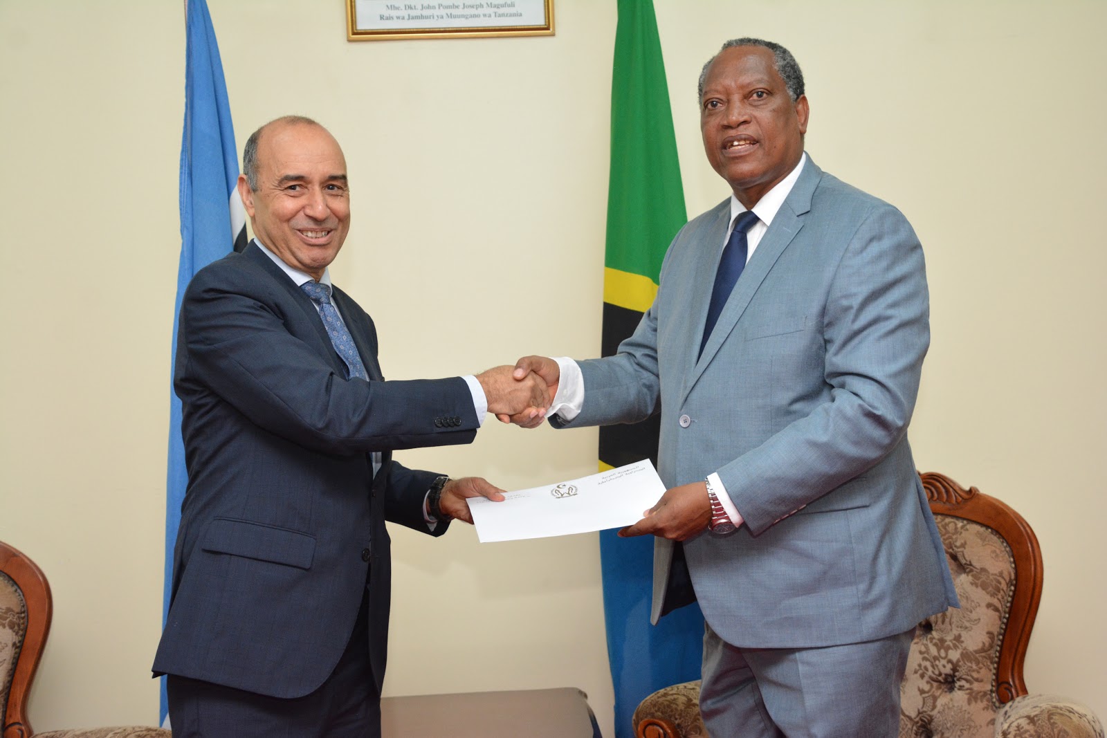 Waziri wa Mambo ya Nje na Ushirikiano wa Afrika Mashariki Profesa Palamagamba John Kabudi (Mb.) akipokea nakala za hati za utambulisho za Mhe. Mahayub Buyema Mahafud, Balozi mteule wa Jamhuri ya Kidemokrasia ya Kiarabu ya Sarahawi nchini Tanzania.
