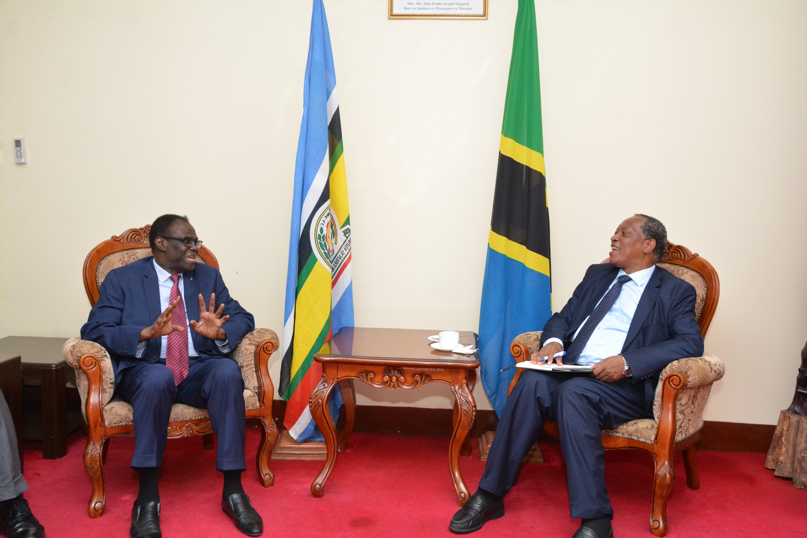 Waziri wa mambo ya Nje na Ushirikiano wa Afrika Mashariki Profesa Palamagamba John Kabudi (Mb.) akiwa katika mazungumzo na Mhe. Mikel Kafando ambaye pia ni Rais Mstaafu wa Burkina Faso na Mjumbe Maalum wa Katibu Mkuu wa Umoja wa Mataifa kuhusu Burundi.