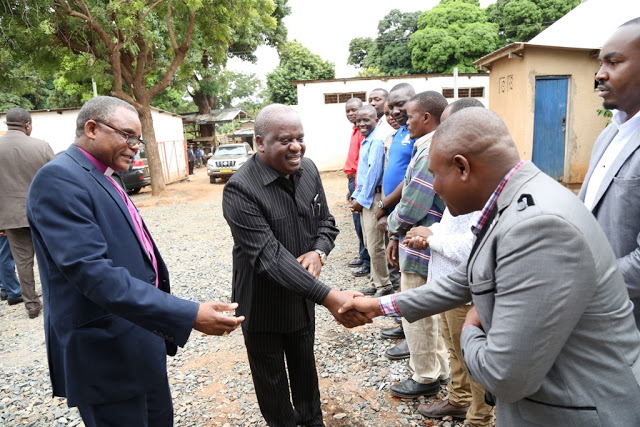 Spika wa Bunge, Mhe. Job Ndugai (wa pili kushoto) akisalimiana na Watumishi wa Ofisi kuu ya wa kanisa la Anglikana Dayosisi ya Mpwapwa alipowatembelea leo Wilayani Mpwapwa Mkoani Dodoma. Kushoto ni Askofu Mkuu Mstaafu wa Kanisa la Anglikana Tanzania, Dkt. Jacob Chimeledya