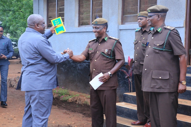 Waziri wa Mambo ya Ndani ya Nchi, Kangi Lugola (kushoto), akimsalimia Kamishna Jenerali wa Magereza, (CGP), Phaustine Kasike, wakati alipokua anawasili Makao Makuu ya Magereza Mkoa wa Morogoro kwa ajili ya ziara ya kikazi. Picha na Wizara ya Mambo ya Ndani ya Nchi.
