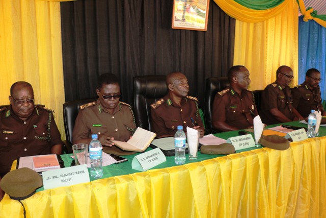 Kamishna Jenerali wa Magereza, Phaustine Kasike akiwa meza kuu pamoja na Makamishna na Manaibu Kamishna wa Jeshi la Magereza wakifuatilia uwasilishaji wa mada mbalimbali wa kikao kazi cha Wakuu wa Magereza yote Tanzania Bara leo Mei 18, 2019 katika Ukumbi wa Magereza Mkoani Morogoro.