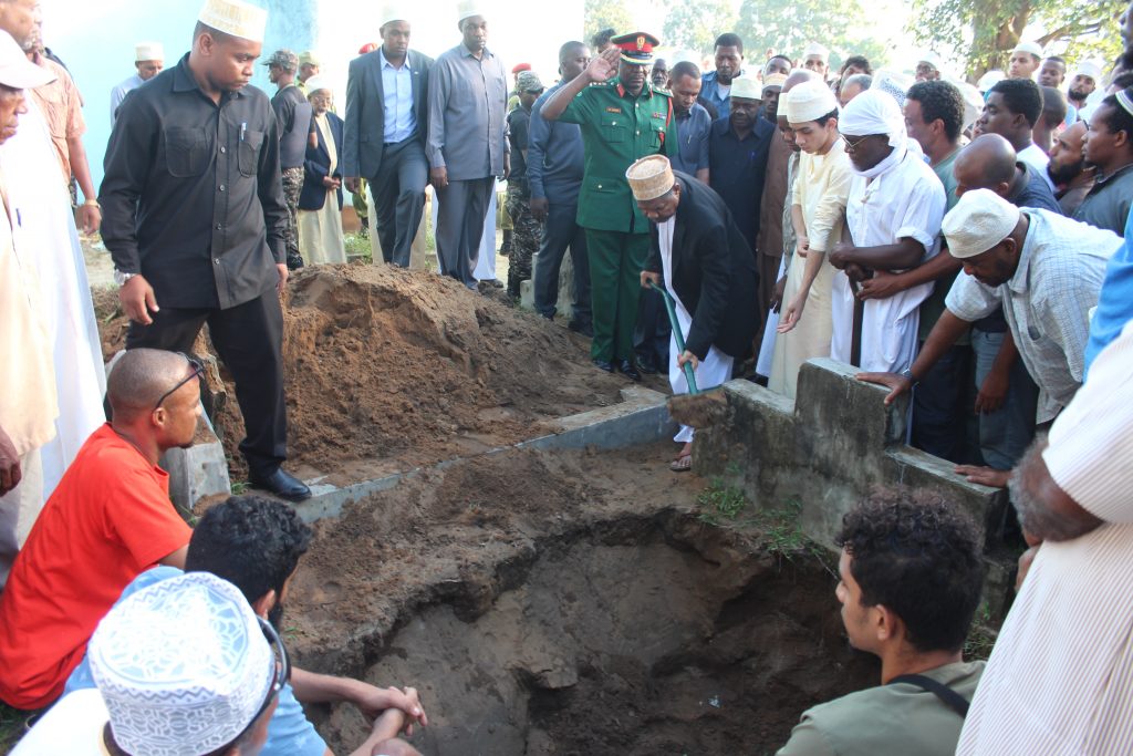 RAIS wa Zanzibar na Mwenyekiti wa Baraza la Mapinduzi Mhe.Dk. Ali Mohamed Shein, akiweka mchanga katika kaburi la Mareheme Ali Ferej, aliyekuwa Mwenyekiti wa ZFA yaliofanyika katika makaburi ya Mwanakwerekwe Zanzibar leo 19-5-2019