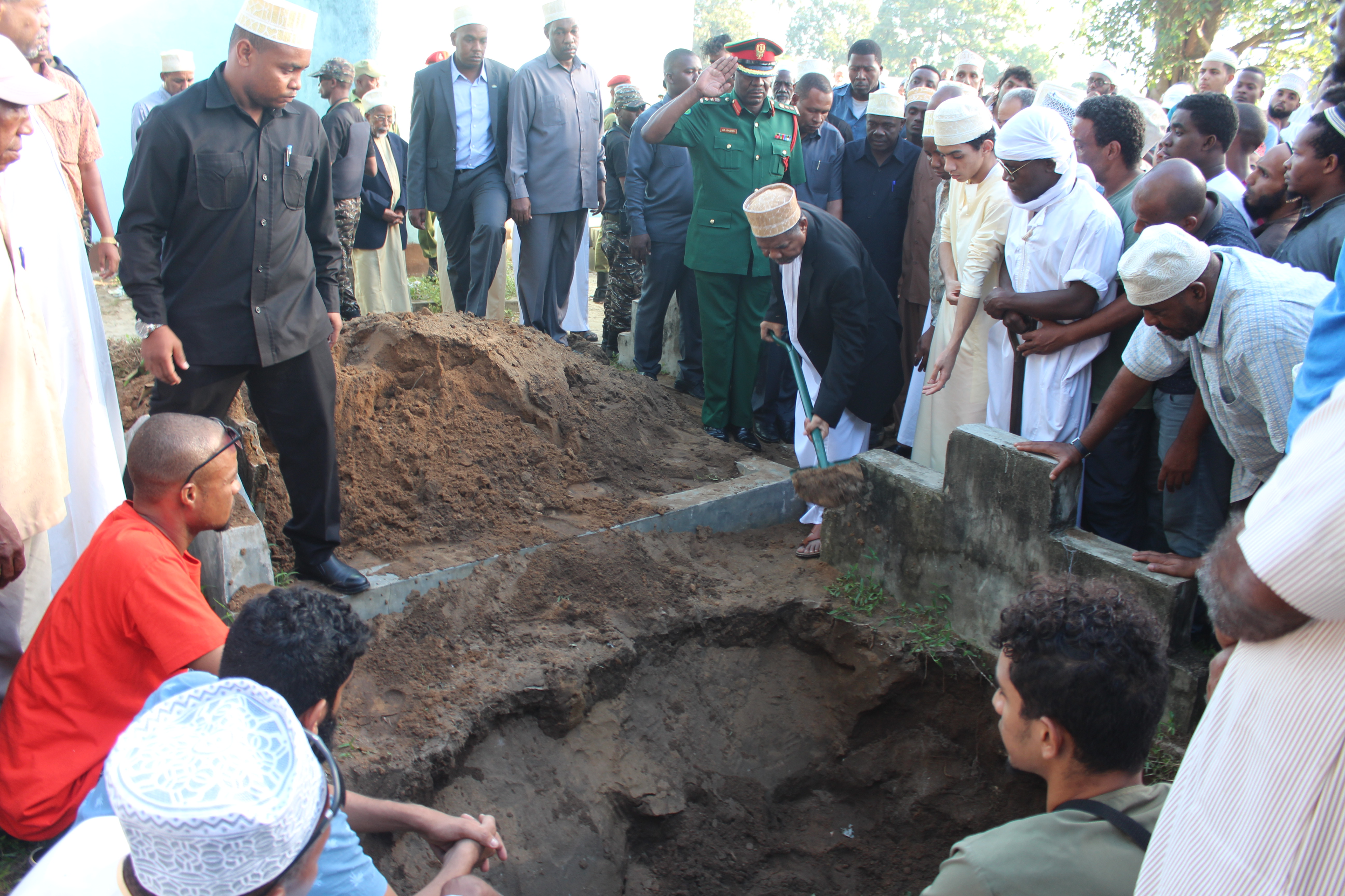 RAIS wa Zanzibar na Mwenyekiti wa Baraza la Mapinduzi Mhe.Dk. Ali Mohamed Shein, akijumuika na Wananchi na Wanamichezo katika maziko ya Marehemu Ali Ferej Tamim , aliyekuwa Mwenyekiti wa Chama cha Mpira Zanzibar(ZFA) yaliofanyika katika makaburi ya Mwanakwerekwe Zanzibar