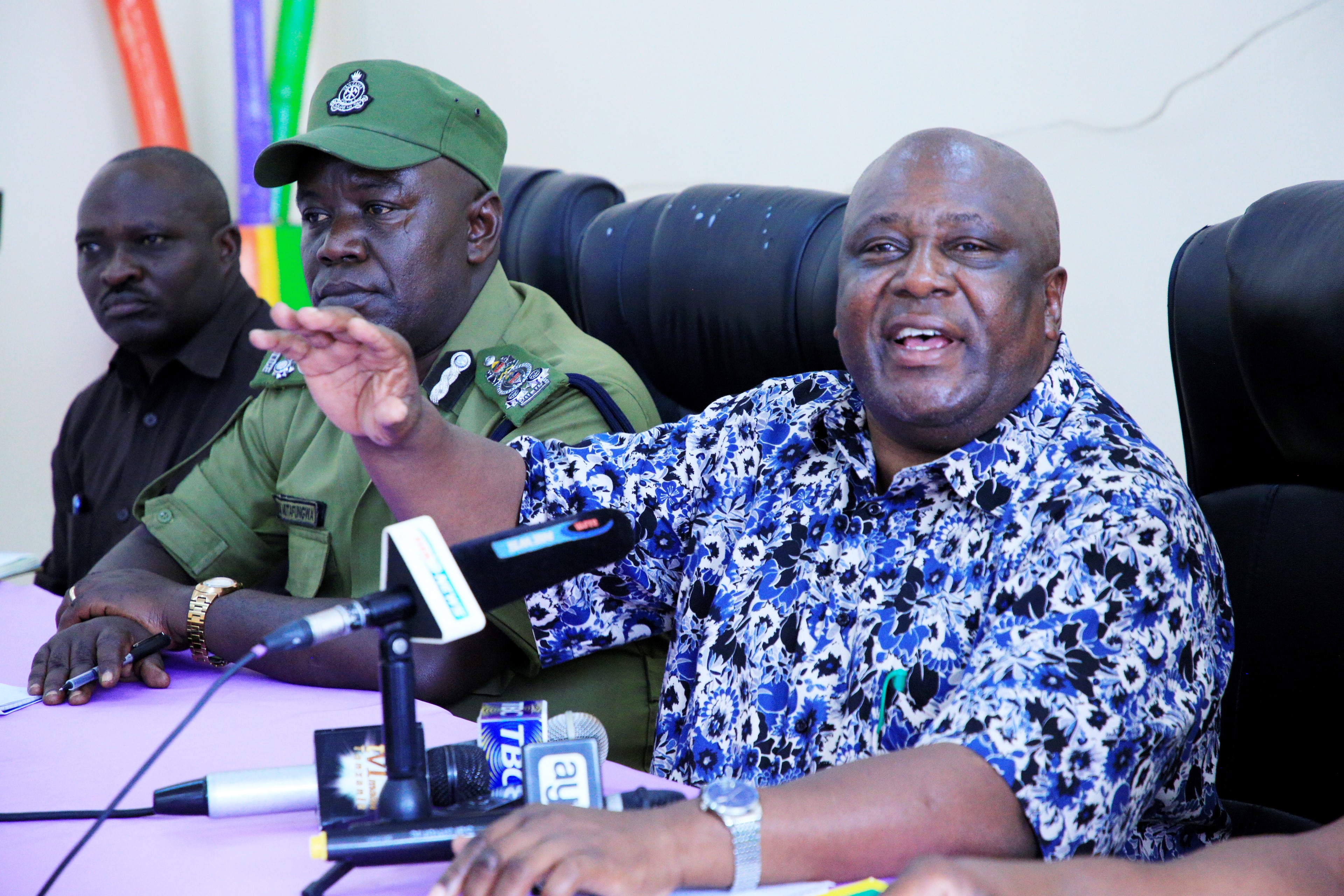Waziri wa Mambo ya Ndani ya Nchi, Kangi Lugola, akizungumza na waandishi wa habari katika Ukumbi wa Mikutano wa Bwalo la JKT Umwema, mjini Morogoro, leo. Waziri Lugola amewatuliza madereva wa vyombo vya moto waliotaka kugoma kutokana na kutopewa mikataba ya kazi, matumizi mabaya ya tochi pamoja na ulipaji wa faini na kusimamishwa hovyo na matrafiki mabarabarani. Lugola mewataka wamiliki wa vyombo vya moto nchini kutoa mikataba ya kazi kwa madereva na wafanyakazi mbalimbali katika makampuni yao. Katikati ni Kamanda wa Polisi Mkoa wa Morogoro, Wilbrod Mutafungwa.