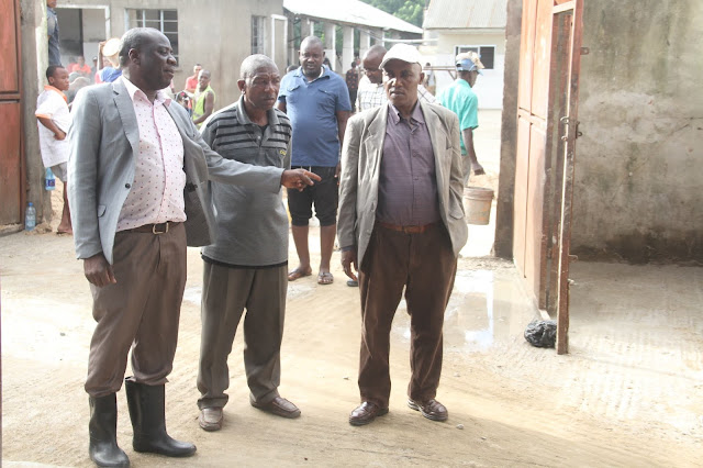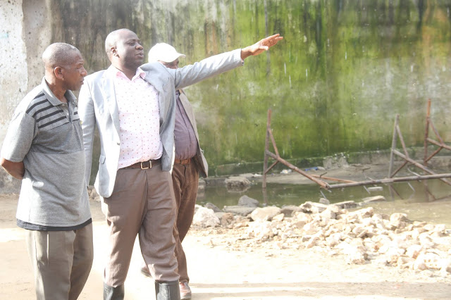 Kaimu Meya wa Manispaa ya Ilala,Omary Kumbilamoto akimueleza Gavana wa Tarafa ya Ukonga namna ukarabati wa soko la Vingunguti unavyoendeleaKaimu meya Manispaa ya Ilala akionyesha sehemu ambayo aijakarabatiwa na maji yanatuwama hivyo kumtaka makandarasi wa eneo hilo kufanya haraka sana kukamilisha ujenziMafundi ujenzi wanaendelea ukarabati katika Machinji ya Vingunguti ambapo kaimu Meya wa Manispaa ya Ilala na Diwani wa Vingunguti Omary Kumbilamoto alitembelea ujenzi huo kuangalia ni hatua gani imefikiwa