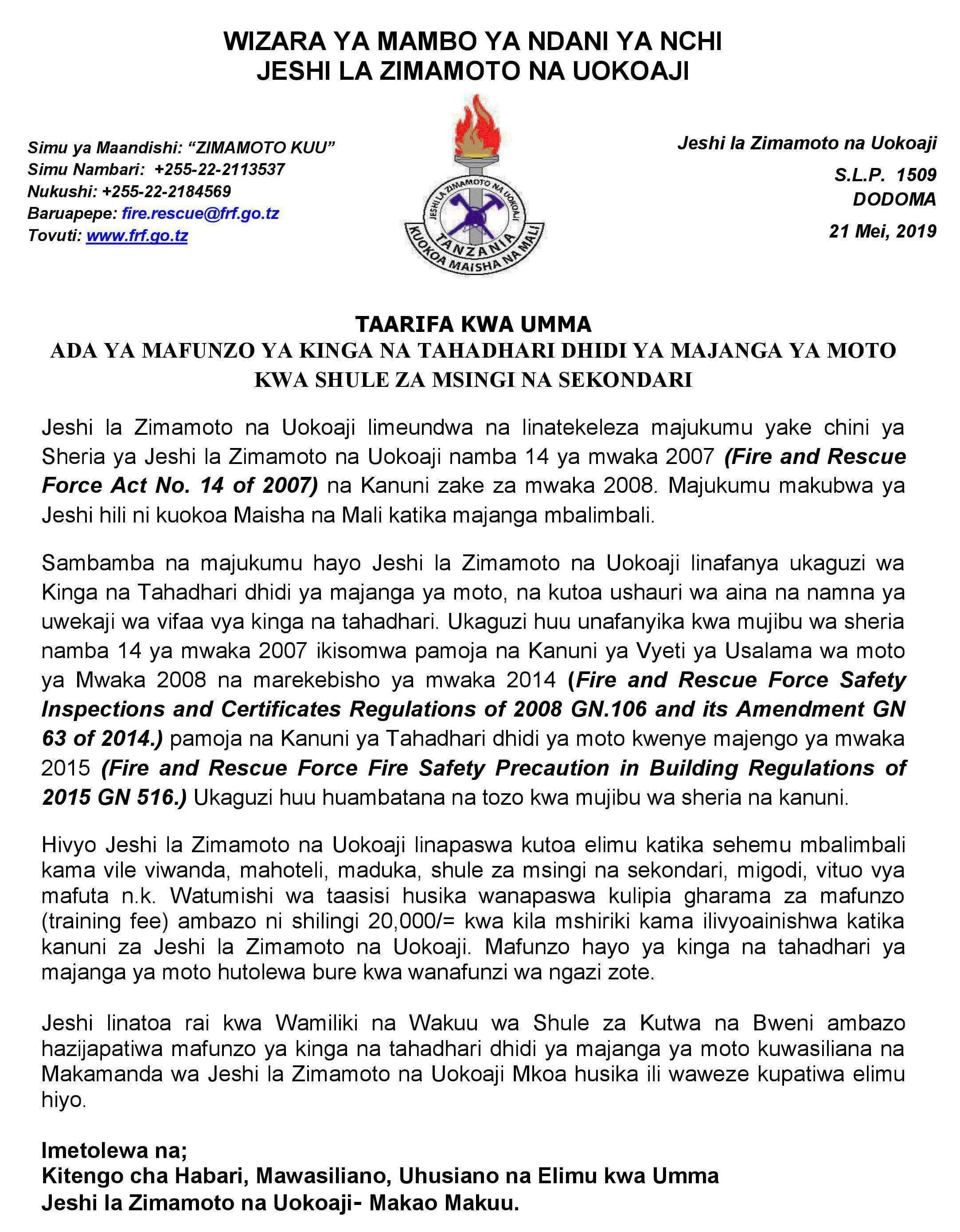 UncategorizedZIMAMOTO YATOA UFAFANUZI KUHUSU MAFUNZO YA KINGA NA TAHADHARI DHIDI YA MAJANGA YA MOTO KWA SHULE ZA MSINGI NA SEKONDARI. Last updated: 2019/05/21 at 12:39 PM John Bukuku 6 years ago Share SHARE John Bukuku May 21, 2019 May 21, 2019 Share this Article Facebook Twitter Email Print Previous Article WAZIRI WA AFYA AKUTANA NA UJUMBE KUTOKA JIMBO LA XUZHOU NCHINI CHINA Next Article RAIS MHE. DKT. MAGUFULI APOKEA GAWIO LA SERIKALI KIASI CHA SHILINGI BILIONI MBILI (2.1) KUTOKA SHIRIKA LA MAWASILIANO TANZANIA TTCL JIJINI DAR ES SALAAM