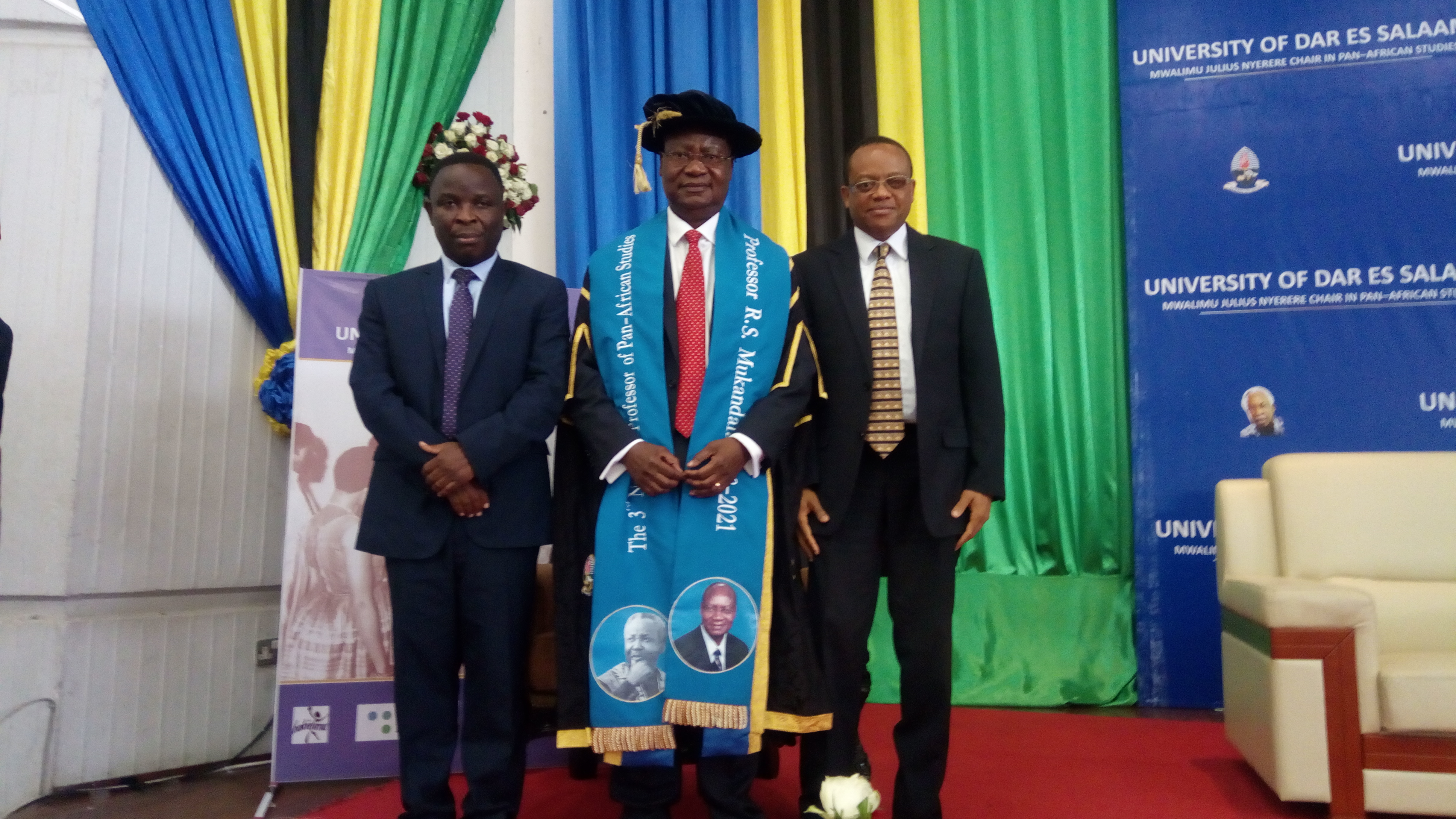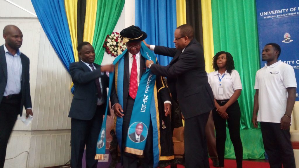 Mwenyekiti wa kigoda cha mwalimu nyerere Prof. Rwekeza Mukandala akisimikwa mbele ya viongozi wa chuo Kikuu cha Dar es Salaam leo katika Ukumbi wa Nkurumah UDSM.