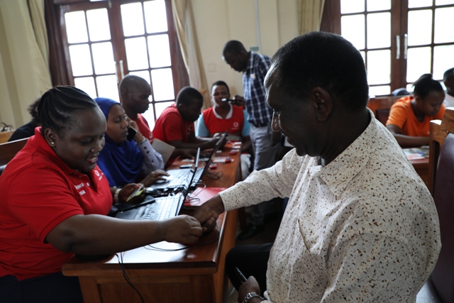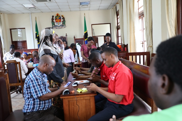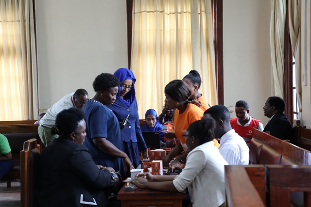 Baadhi ya watumishi wa Mahakama ya Tanzania wakisajili laini za simu kwa alama za vidole katika kampuni mbalimbali za simu, wakati wa usajili huo uliofanyika leo kwenye ukumbi namba moja wa Mahakama ya Rufaa Tanzania.