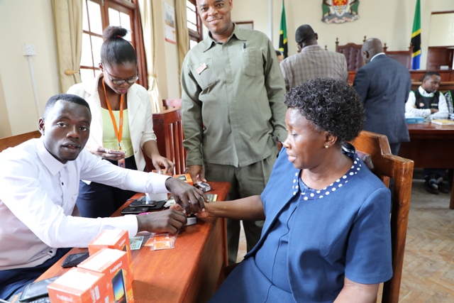 Jaji wa Mahakama ya Rufaa Tanzania, Mhe, Rehema Mkuye akisajili laini ya simu kwa alama za vidole katika kampuni ya Halotel. Usajili huo umefanyika leo kwenye ukumbi namba moja wa Mahakama ya Rufaa Tanzania.