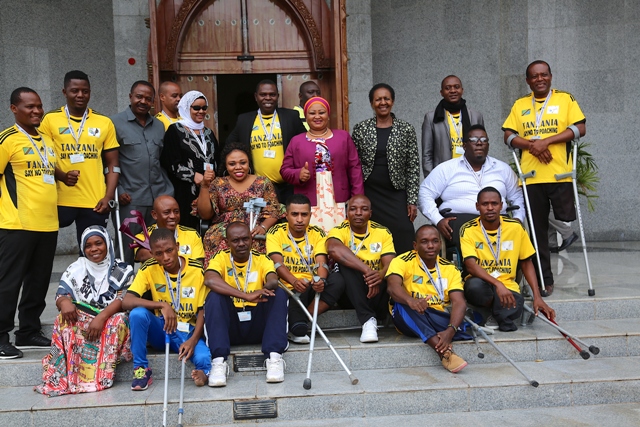 Naibu Waziri Ofisi ya Waziri Mkuu, Mhe. Stella Ikupa (aliyekaa katikati) akiwa katika picha ya pamoja na wachezaji wa Time ya Taifa ya Soka ya Walemavu- Tembo Worriors kwenye viwanja vya Bunge jijini Dodoma, Mei 23, 2019. Waliosimama, wa tatu kushoto ni Mbunge wa Kilolo, Venance Mwamoto, wa tatu kulia ni Mbunge wa Urambo, Margareth Sitta na wa nne kulia ni Mbunge wa Viti Maalum Amina Mollel. (Picha na Ofisi ya Waziri Mkuu)