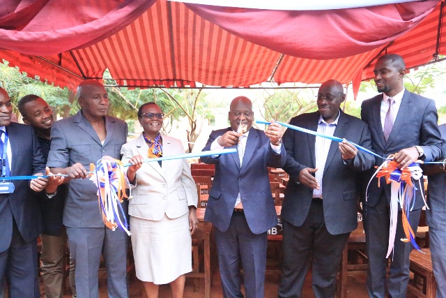 Spika wa Bunge Job Ndugai akikata utepe kama ishara ya kupokea msaada wa Mabati 250 kwa ajili ya ujenzi wa maabara ya shule ya sekondari Chiwe na meza na viti 126 kwa ajili ya shule ya sekondari Mnyakongo zote za Wilayani Kongwa. Msaada huo una thamani ya shilingi Milioni 10. Wengine katika Picha ni Mjumbe wa Bodi ya NMB – Margaret Ikongo, Mwenyekiti wa Halmashauri ya Kongwa – Zuberi White (kulia kwake), kushoto ni Afisa Mkuu Uendeshaji, Bidhaa na Matumizi ya Digitali wa NMB – Pete Novat na Meneja wa NMB Kanda ya Kati Nsolo Mlozi