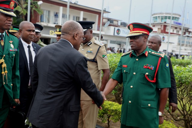 Rais wa Jamhuri ya Muungano wa Tanzania Dkt. John Pombe Magufuli akiagana na Mkuu wa Majeshi Jenerali Venance Mabeyo wakati akiondoka katika Uwanja wa Ndege wa Kimataifa wa Julius Nyerere kuelekea Afrika ya Kusini asubuhi hii ambapo kesho atahudhuria sherehe za kuapishwa kwa Rais wa nchi hiyo Mhe. Cyril Ramaphosa mjini Pretoria