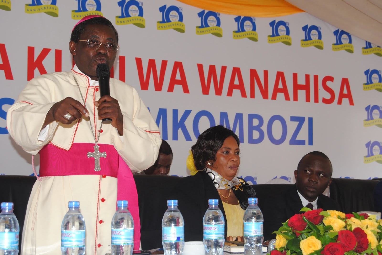 Askofu Mkuu wa Jimbo Kuu Katoliki Dodoma, Beatus Kinyaiya, akizungumza katika Mkutano Mkuu wa Kumi wa Wanahisa wa Benki ya Biashara Mkombozi uliofanyika jijini Dar es Salaam jana. Kutoka kulia ni Kaimu Mkurugenzi Mtendaji wa benki hiyo, Thomas Enock na Kaimu Mwenyekiti wa bodi, Profesa Marcellina Chijoriga.