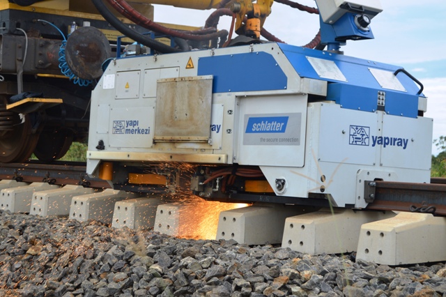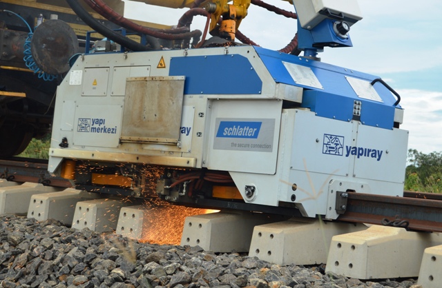Moja ya Kifaa cha kampuni inayojenga Reli ya Kisasa, SGR ya Yapi Merkez kikiunganishaji Reli hiyo katika moja ya zaiara ya Wakuu wa Mikoa, Wakuu wa Wilaya, Wakurugenzi na Makataibu tawala takribani 400, Mei 14, 2019.
