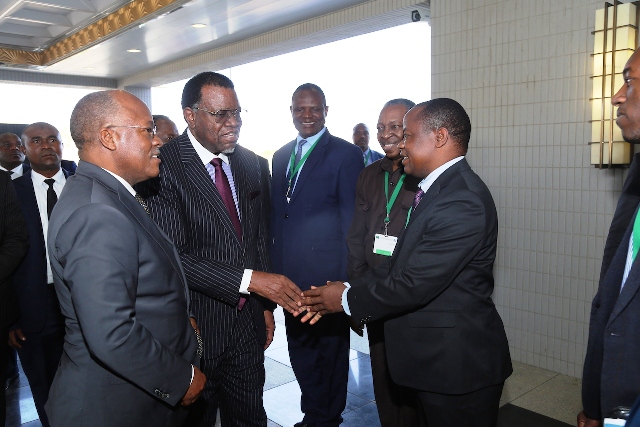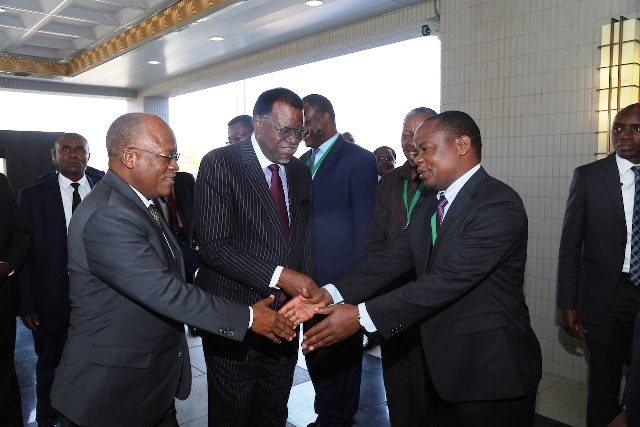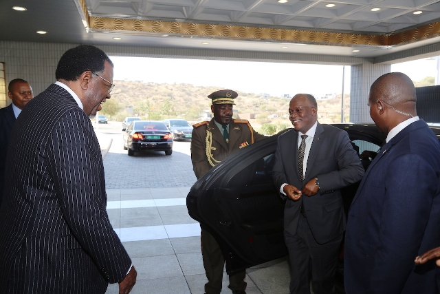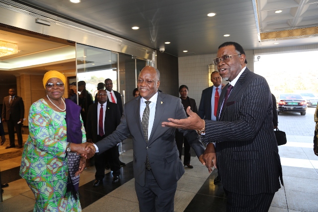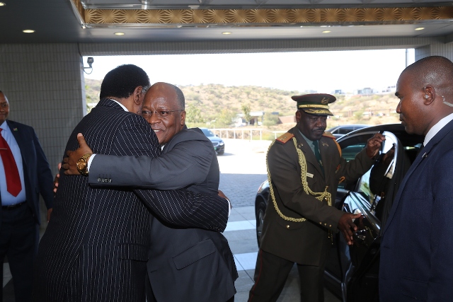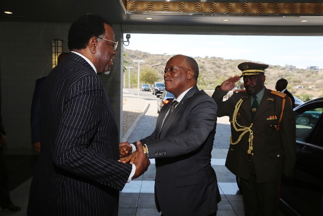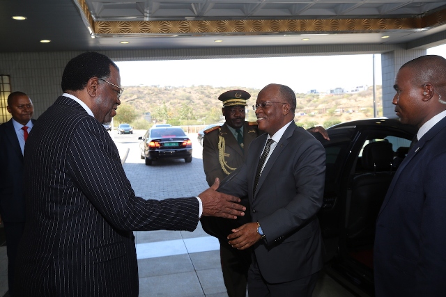 Rais wa Jamhuri ya Muungano wa Tanzania, Dkt. John Pombe Magufuli akipokewa na Mwenyeji wake Rais Hage Geingob wa Namibia alipowasili katika Ikulu ya nchi hiyo, Jijini Windhoek leo Mei 27, 2019. Rais Dkt. Magufuli amewasili nchini Namibia kwa Ziara Rasmi ya Kikazi ya Siku mbili.