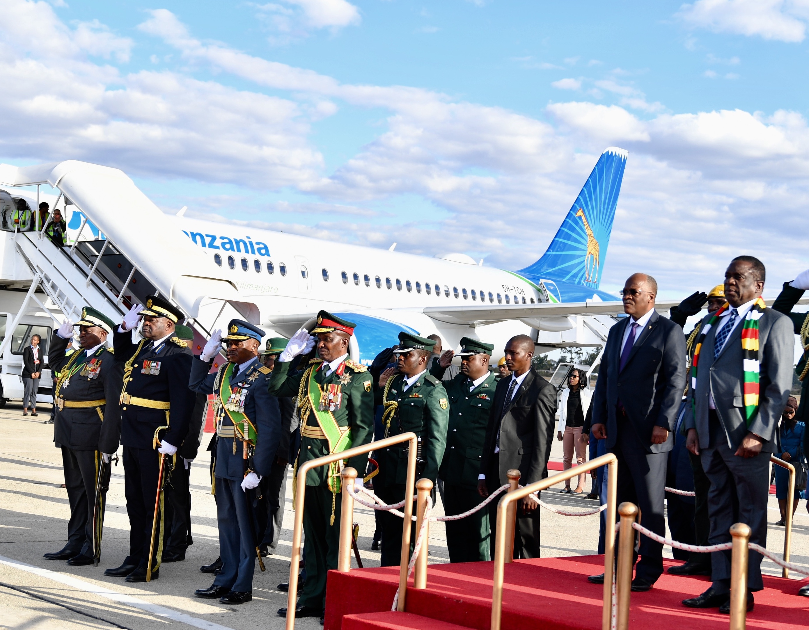 RAIS MHE. DKT. JOHN POMBE MAGUFULI AWASILI NCHINI ZIMBABWE NA KUPOKELEWA NA MWENYEJI WAKE RAIS WA ZIMBABWE EMMERSON MNANGAGWA KATIKA UWANJA WA NDEGE WA ROBERT MUGABE NCHINI ZIMBABWE