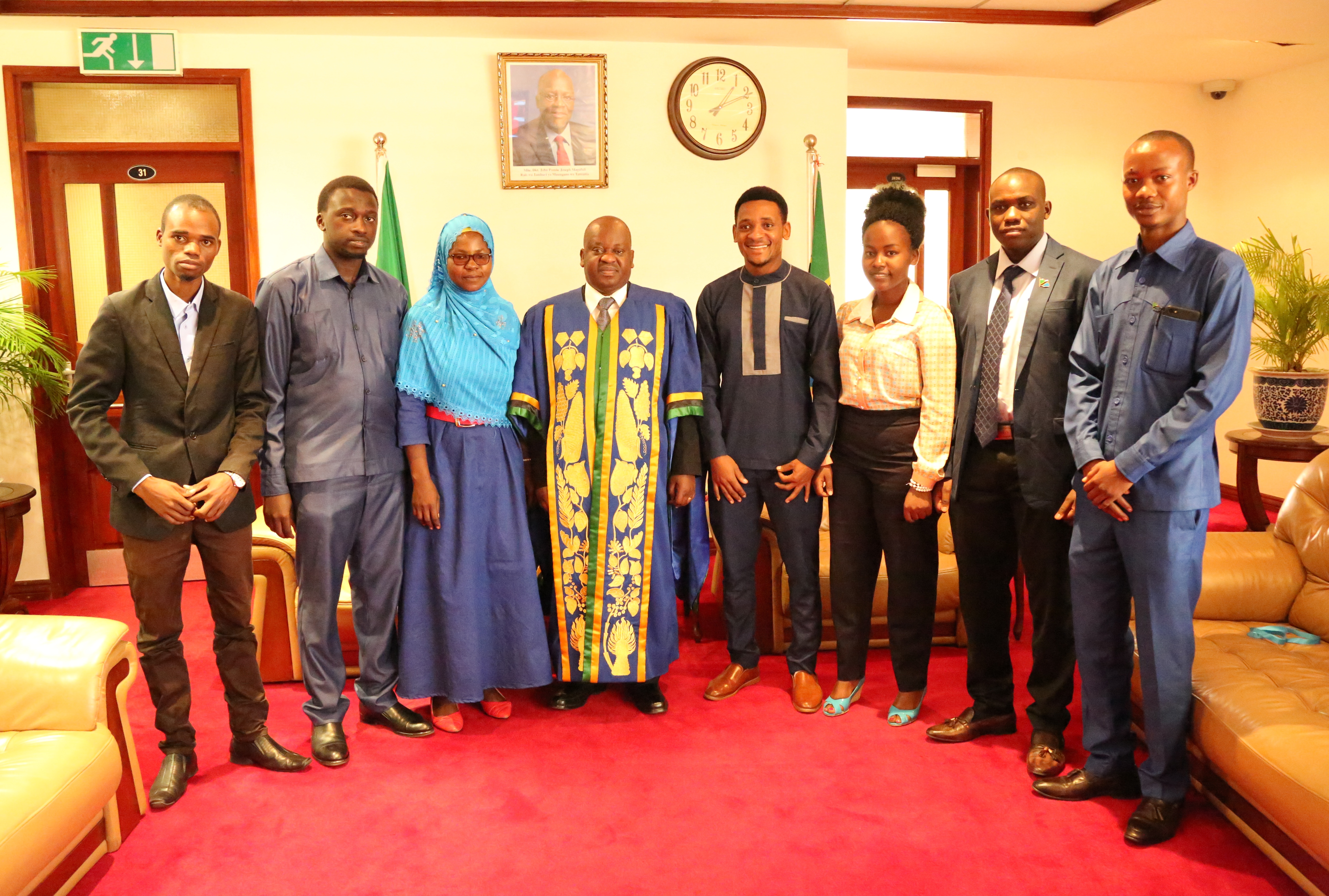 Spika wa Bunge, Mhe. Job ndugai (Mwenye joho) akiwa katika picha ya pamoja na uongozi wa Bunge la Vijana 2018/2019 ulipomtembelea leo Ofisini kwake Bungeni Jijini Dodoma. Walioongozwa na Spika wa Bunge hilo, Ndg. Zephania Sane (wa nne kulia)
