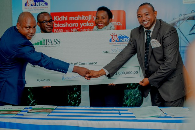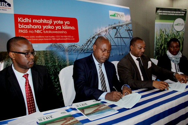Mkurugenzi Mtendaji wa Benki ya NBC, Theobald Sabi (wa pili kushoto), akipokea mfano wa hundi wa Dola 1,000,000 kutoka kwa Mkurugenzi Mtendaji wa Asasi ya Kusaidia Sekta Binafsi ya Kilimo (PASS), Nicomed Bohay makabaliano yatakayoiwezesha NBC kusaidia mnyororo wa thamani wa sekta ya kilimo biashara nchini. Kushoto ni Mkurugenzi wa Biashara wa NBC, Elvis Ndunguru na Ofisa Mtendaji Mkuu wa PASS, Anna Shenalingigwa.