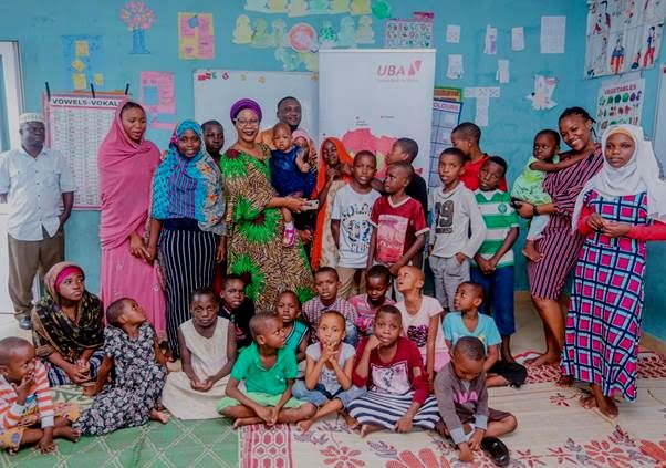 Meneja Masoko na Mawasiliano wa Benki ya UBA Tanzania, Brendansia Kileo (wa pili wa kulia), akiwa na amembeba mtoto wa kituo kimojawapo cha yatima jijini Dar es Salaam, ikiwa ni sehemu ya maadhimisho ya Wiki ya Afrika.