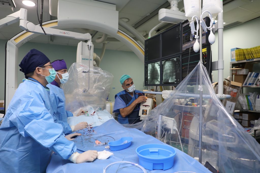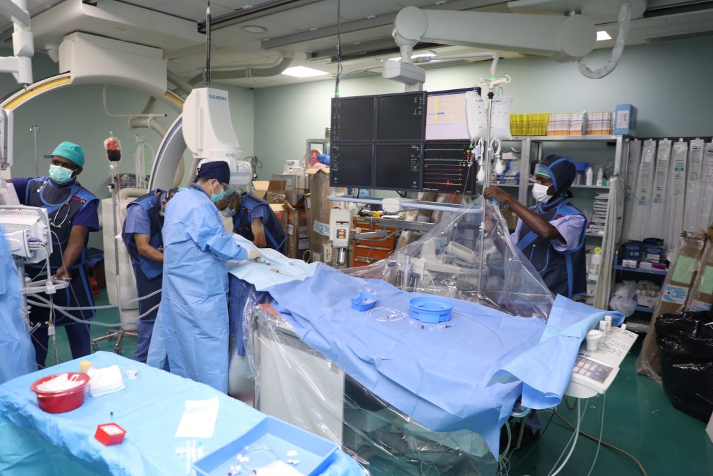 Madaktari bingwa wa magonjwa ya moyo kwa watoto wa Taasisi ya Moyo Jakaya Kikwete (JKCI) kwa kushirikiana na wenzao kutoka Shirika la Okoa Moyo wa Mtoto (Save a Child’s Heart – SACH) la nchini Israel wakimfanyia upasuaji wa bila kufungua kifua kupitia tundu dogo kwenye paja mtoto mwenye magonjwa ya moyo ya kuzaliwa nayo “Congenital Heart Disease” wakati wa kambi maalum ya matibabu ya siku saba inayofanywa na madaktari hao katika taasisi hiyo. Jumla ya watoto 11 wenye magonjwa ya moyo ya kuzaliwa nayo wamefanyiwa upasuaji mdogo wa moyo wa bila kufungua kifua na hali zao zinaendelea vizuri
