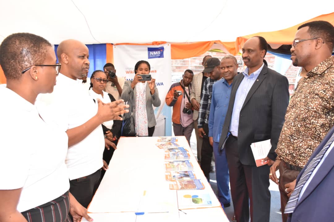 Waziri wa Mifugo na Uvuvi, Luhaga Mpina akizungumza jambo na Meneja Mwandamizi wa idara ya Kilimo biashara NMB Oscar Rwechungura pamoja na wafanyakazi wa NMB kwenye banda la benki hiyo wakati wa Wiki ya Maziwa kitaifa iliyofanyika jijini Arusha.
