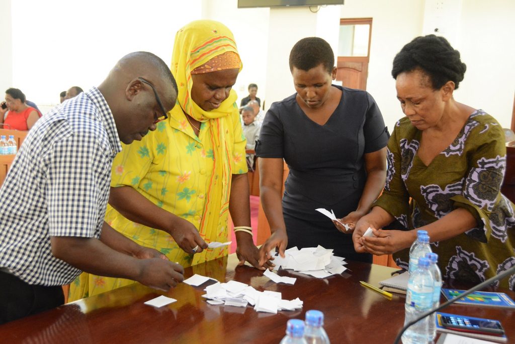Wajumbe wakifuatilia shughuli ya kuhesabu kura leo.