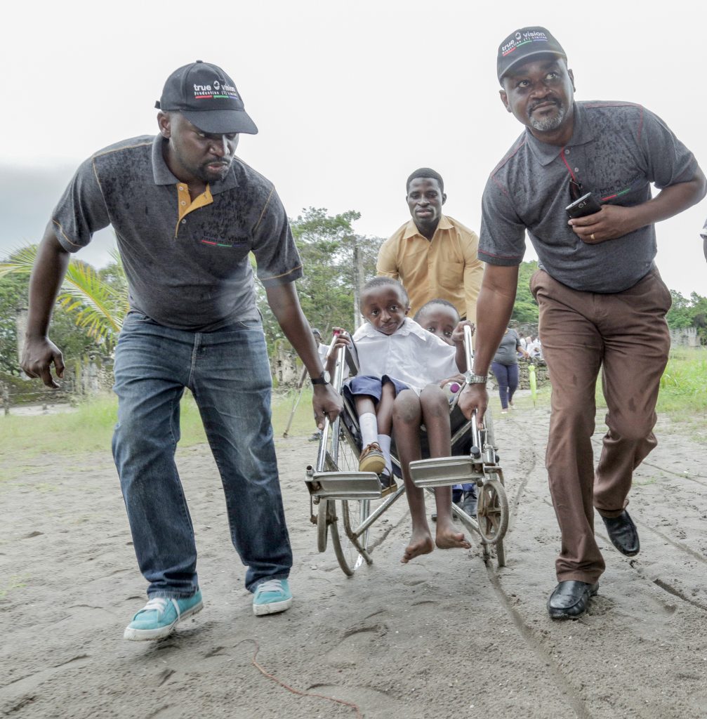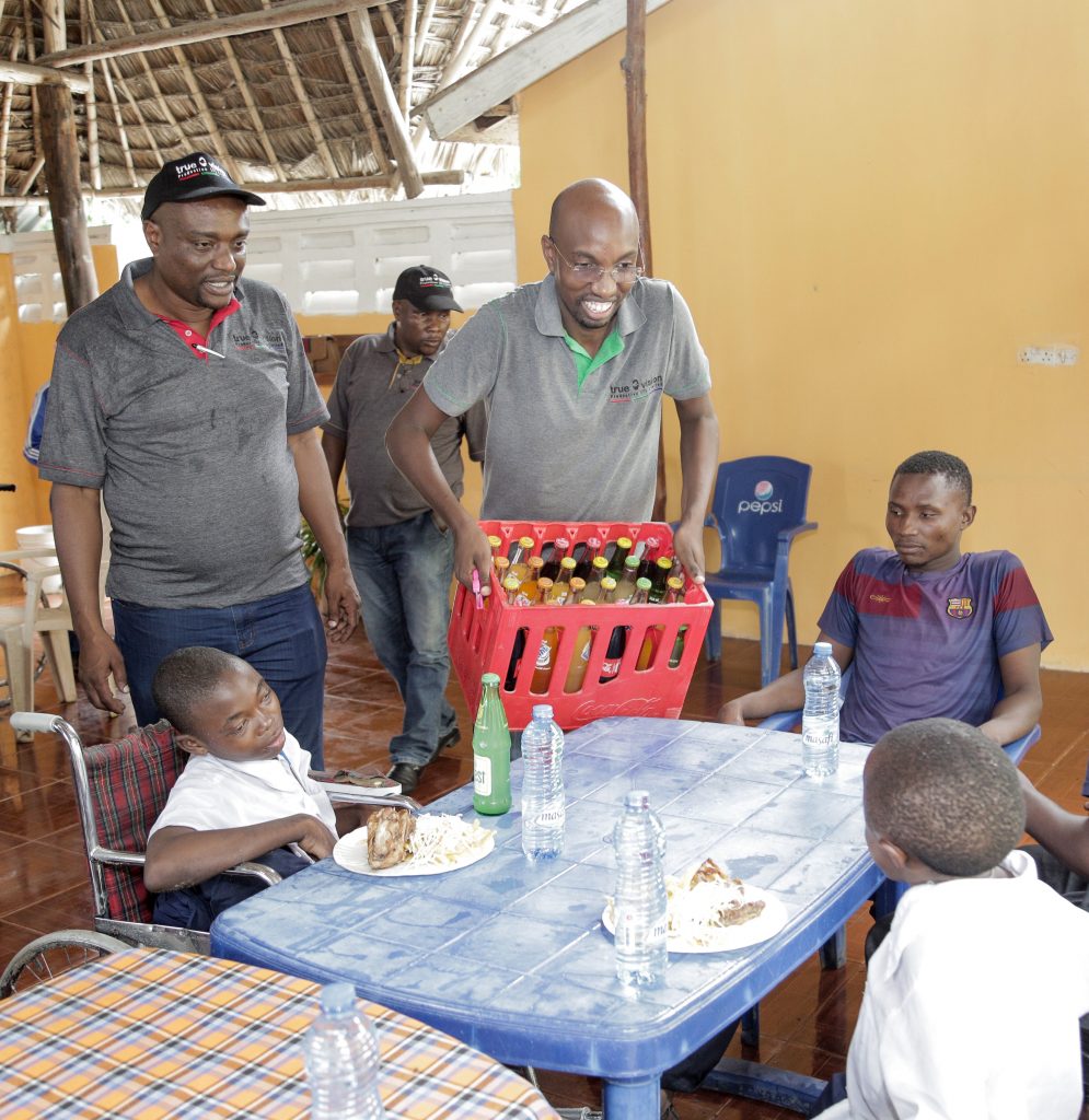 Baadhi ya wafanyakazi wa kampuni ya True Vision Production wakiwasaidi watoto wenye ulemavu wakati wa ziara yao
