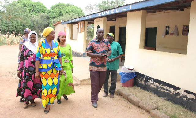 Wa pili kulia ni diwani wa kata ya Mwenge Edward Maganga akimwongoza Mbunge wa viti Maalum Mkoa wa Shinyanga Mhe. Azza Hilal Hamad (wa pili kushoto) na Mkuu wa wilaya ya Shinyanga,Mhe.Jasinta Mboneko (katikati) walipowasili katika zahanati ya Zunzuli Juni 7,2019 .