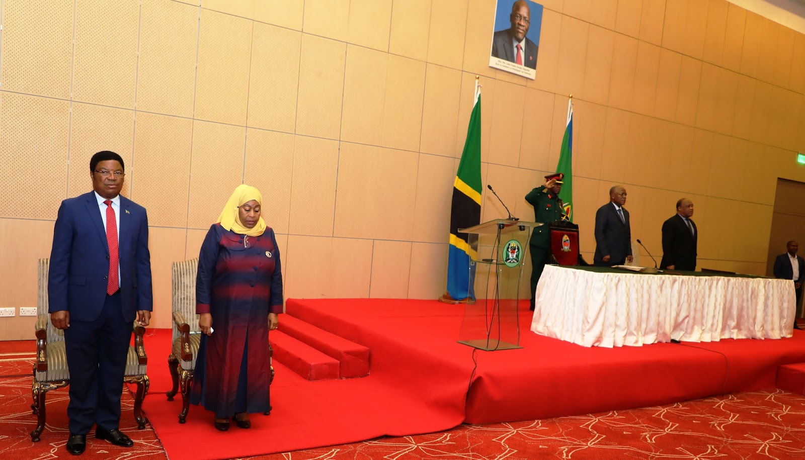 Samia Suluhu Hassan na Waziri Mkuu wakisimama wimbo wa Taifa