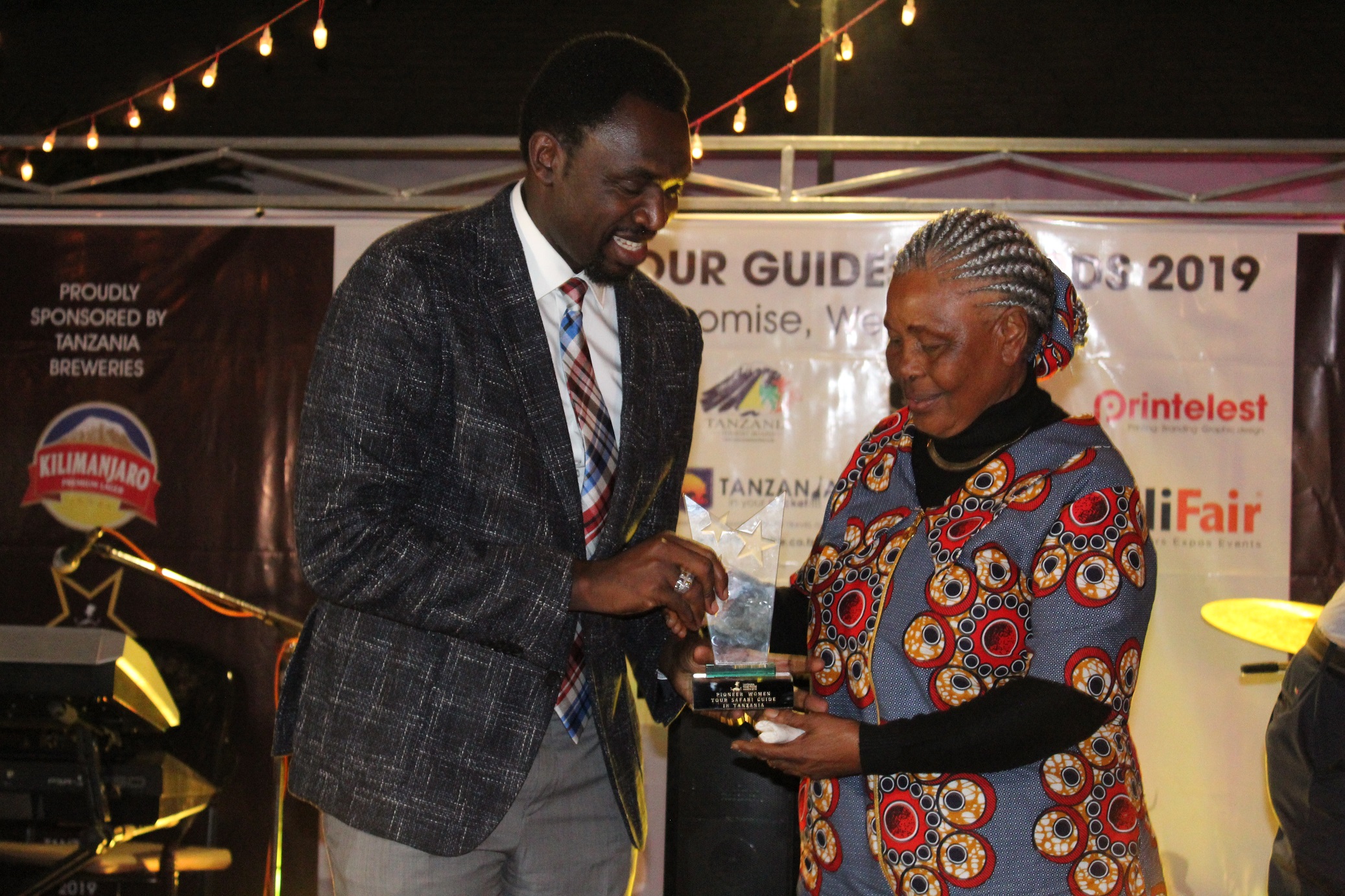 Waziri wa Maliasili na Utalii, Mhe. Dkt. Hamisi Kigwangalla akimkabidhi Tuzo ya mwongoza Watalii Bora wa muda mrefu Bi. Mary Mushi kwa kufanya kazi ya kuongoza Watalii Mlima Kilimanjaro tangu mwaka 1979.