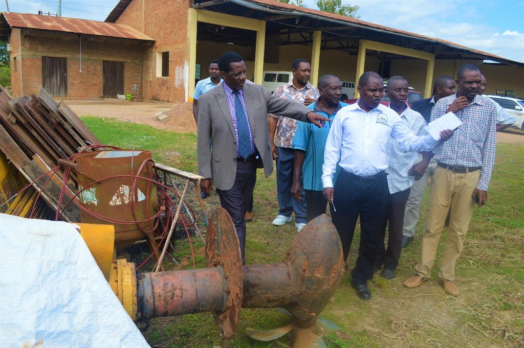 Mtendaji Mkuu wa Wakala wa Ufundi na Umeme (TEMESA) Mhandisi Japhet Y. Maselle kushoto, Mhandisi Jairos Nkoroka (wa tatu kulia) pamoja na wafanyakazi wakikagua propella za vivuko vilivyohifadhiwa katika karakana ya mji wa Ifakara baada ya daraja la mto Kilombero kukamililika. Vivuko hivyo, MV.Kilombero I na II vitaanza kukarabatiwa na kuunganishwa hivi karibuni tayari kwa hatua ya kupelekwa katika eneo la Kikove Malinyi kwa ajili ya kutoa huduma.
