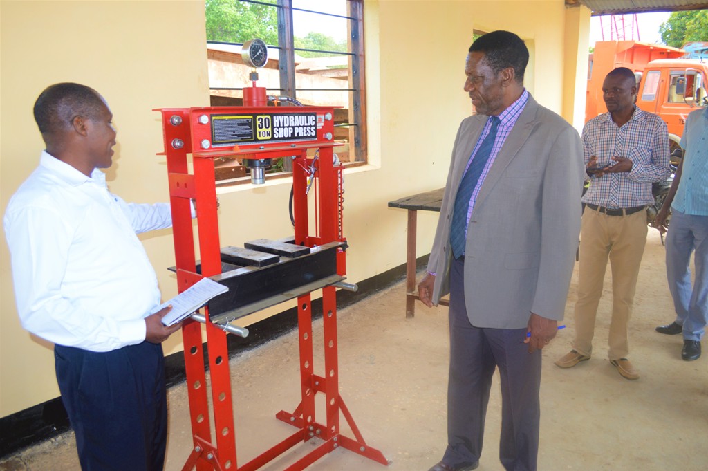 Mhandisi Jairos Nkoroka kushoto akimuonyesha Mtendaji Mkuu wa Wakala wa Ufundi na Umeme (TEMESA) Mhandisi Japhet Y. Maselle mashine ya kugandamiza vipuri vya magari (press machine) wakati alipotembelea kukagua utendaji kazi wa karakana hiyo mpya ya TEMESA iliyoanza kutoa huduma mwezi Juni mwaka huu katika Halmashauri ya mji wa Ifakara wilayani Kilombero mkoani Morogoro. Karakana hiyo sasa itahudumia wilaya zote za karibu ikiwemo wilaya ya Ulanga na Malinyi ambazo awali zilikuwa zikitegemea kupata huduma Morogoro mjini.