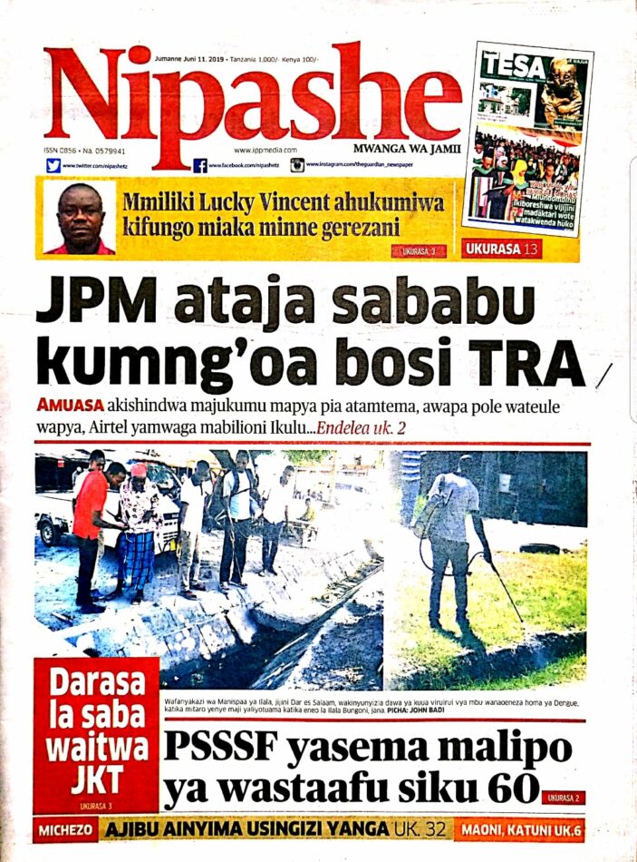 MagazetiPITIA VICHWA VYA HABARI KATIKA MAGAZETI YA LEO JUMANNE JUNI 11,2019 Last updated: 2019/06/11 at 2:53 AM Alex Sonna 6 years ago Share SHARE Alex Sonna June 11, 2019 June 11, 2019 Share this Article Facebook Twitter Email Print Previous Article WAZIRI WA NISHATI AFANYA ZIARASHINYANGA, AWASHA UMEME VIJIJINI Next Article WAZIRI KIGWANGALLA AINGILIA KATI NA KUMALIZA MGOGORO WA ARDHI HIFADHI NGORONGORO NA WANANCHI