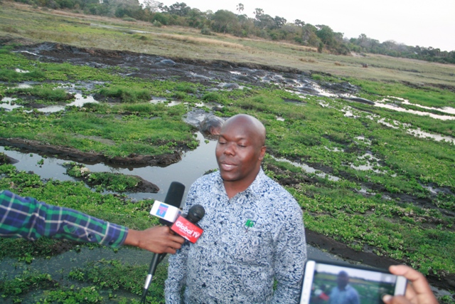 Mkuu wa mkoa wa Katavi Mh. Juma Homera akitoa maelezo kwa waandishi wa habari waliotembelea mto wenye viboko uliopo katika hifadhi hiyo kwa mbali kinachoonekana nyuma ya Mkuu wa mkoa siyo tope ni viboko wakiwa walelala katika tope hilo.