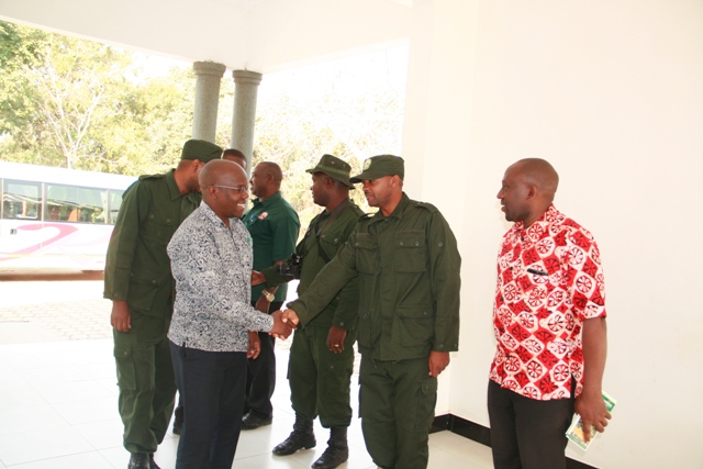 Mkuu wa mkoa wa Katavi Mh. Juma Homera akipokelewa na wahifadhi mbalimbali wa hifadhi ya wanyamapori ya Katavi wakati alipowaongoza waandishi wa habari kutembelea vivutio vya hifadhi hiyo leo.