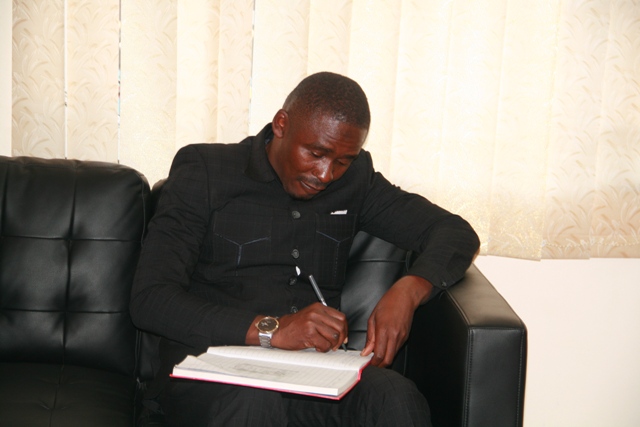Meneja wa Mamlaka ya Bandari za Ziwa Tanganyika(TPA) Kigoma , Bw. Ajuaye Kheri Msese akisaini kitabu cha wageni.