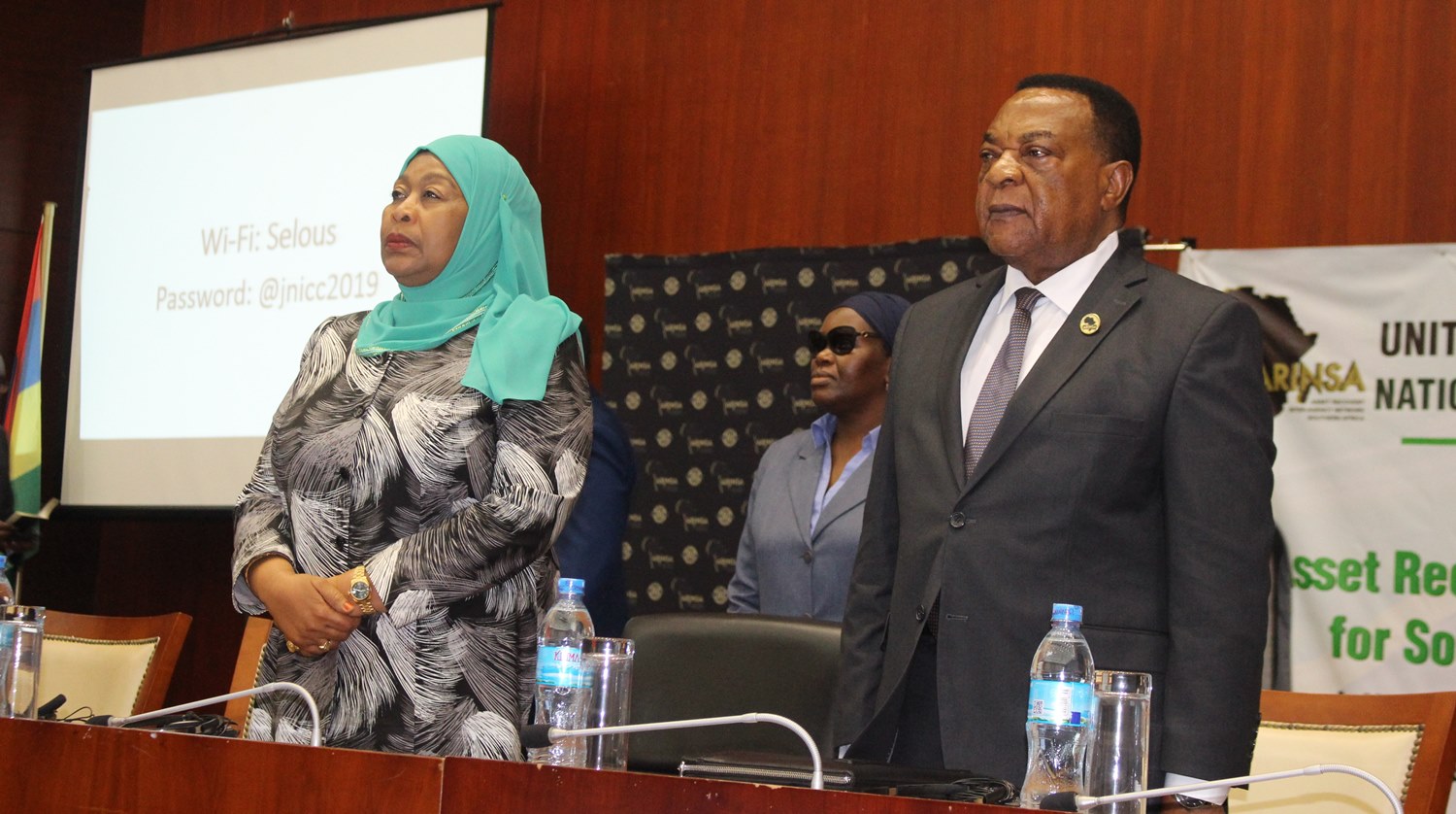 Hassan(katikati) akiwa katika Mkutano wa Umoja wa Urejeshaji wa Mali zinazohusu uhalifu uliofanyika Jijini Dar es Salaam leo , ARINSA pia walifanya maadhimisho ya Miaka 10 tangu kuanzishwa kwake 2009,kutoka kulia ni Mkuu wa Mpango wa Kuzuia Utakatishaji Fedha, Michiel Van Dyk, Mkurugenzi Mkuu wa Mashitaka (DPP) Tanzania, Waziri wa Katiba na Sheria, Dkt.Augustine Mahiga, Kushoto ni Jaji Dkt.Eliezer Mbuki Feleshi, na Mshauri wa UNOC, Fitz Ray Drayton.