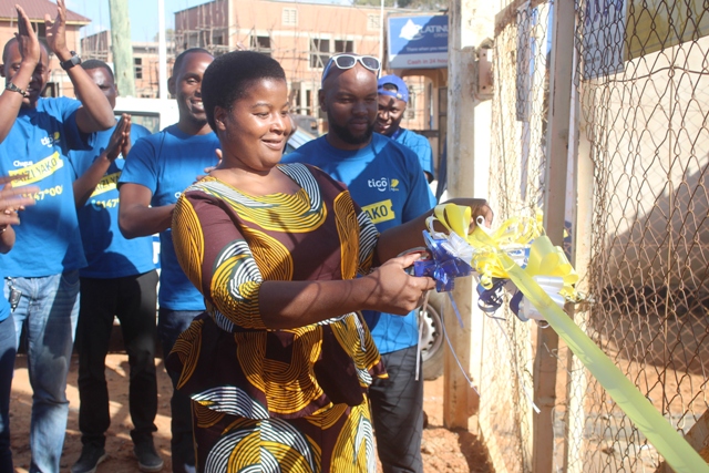 Katibu Tawala wa Manispaa ya Sumbawanga Christina Mzena akikata utepe kuashiria uzinduzi rasmi wa mnara wa 4G wilayani humo. Wanaoshangilia ni baadhi ya wafanyakazi wa Tigo waliohudhuria uzinduzi huo jana.
