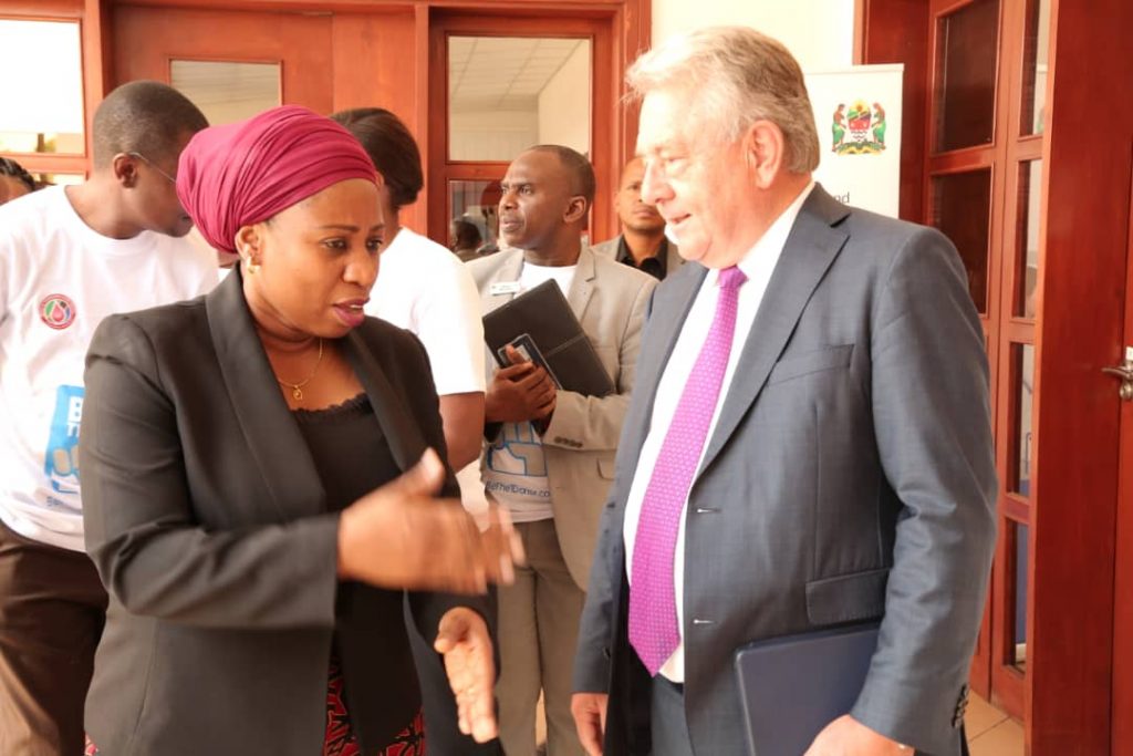 Waziri wa Afya, Maendeleo ya Jamii, Jinsia, Wazee na Watoto, Ummy Mwalimu pamoja na viongozi wa kutoka Wizara ya Afya wakiongea na moja kati ya watu waliojitokeza kuchangia damu, katika Maadhimisho ya Siku ya Wachangia Damu Duniani yaliyofanyika kitaifa jijini Mwanza, viwanja vya Furahisha.