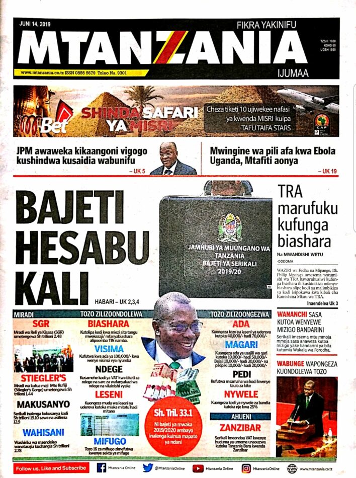 MagazetiPITIA VICHWA VYA HABARI KATIKA MAGAZETI YA LEO IJUMAA JUNI 14,2019 Last updated: 2019/06/14 at 2:56 AM Alex Sonna 6 years ago Share SHARE Alex Sonna June 14, 2019 June 14, 2019 Share this Article Facebook Twitter Email Print Previous Article TUME YA KUREKEBISHA SHERIA YAKABIDHI RIPOTI YA MAPITIO YA SHERIA KATIKA ENEO LA HIFADHI YA NGORONGORO Next Article TAIFA STARAS YACHAPWA 1-0 NA MISRI MECHI YA KIRAFIKI