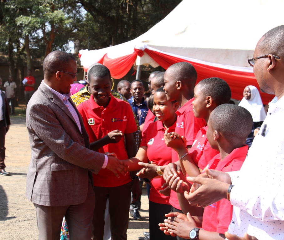 Katibu Mkuu Idara Kuu Maendeleo ya Jamii Dkt. John Jingu akisalimiana na wajumbe wa Baraza la Watoto Taifa katika uzinduzi wa Kitini cha Mafunzo ya uwezeshaji wa mabaraza ya watoto nchini uliofanyika mkoani Geita kuelekea Siku ya Mtoto wa Afrika Juni, 16 pembeni yake ni Mwenyekiti wa Baraza hilo Joel Festo.