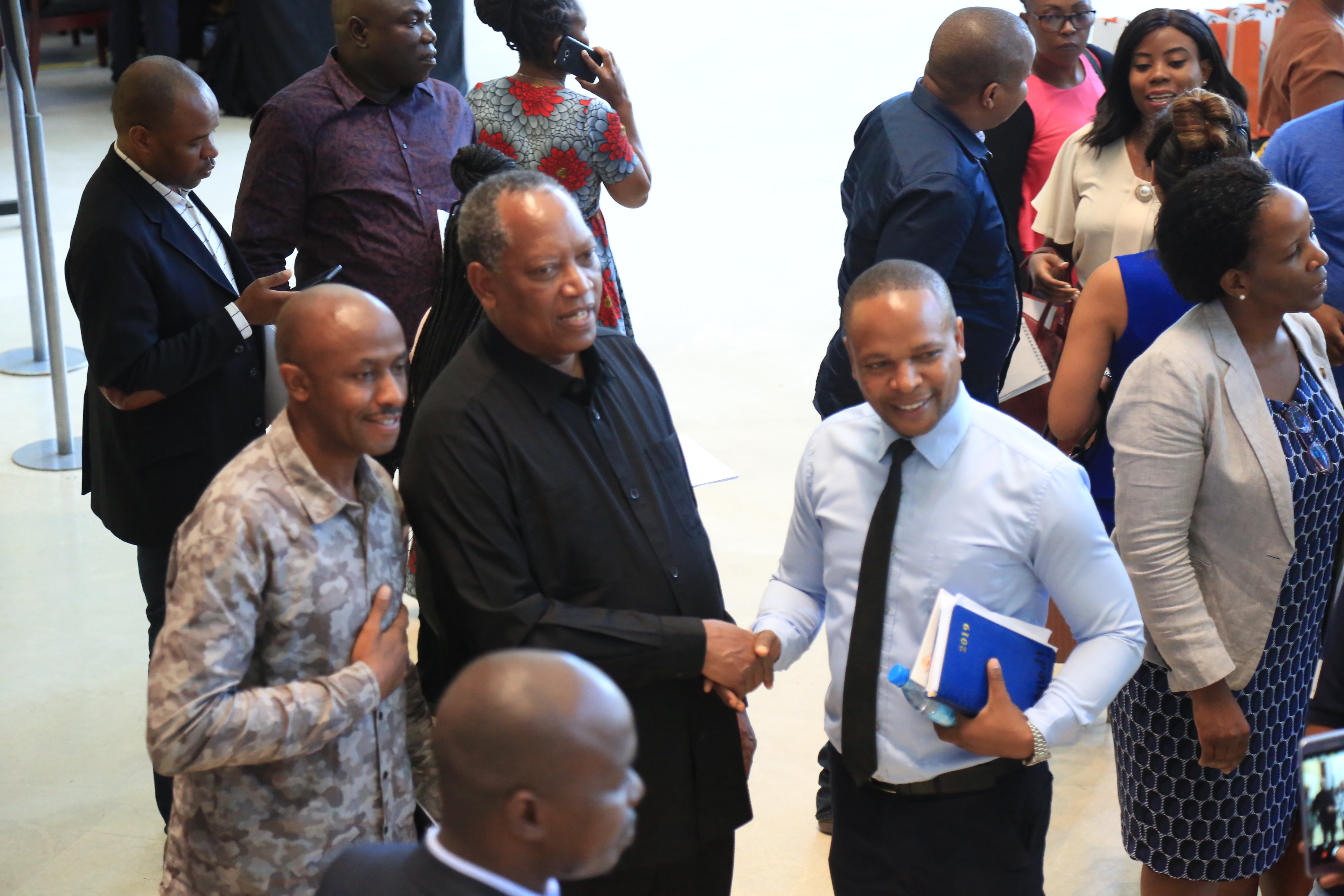 Waziri wa mambo ya Nje na Ushirikiano wa Afrika Mashariki Prof. Palamagamba John Kabudi akisalimiana na baadhi ya wamiliki na wafanyabiashara wa Hoteli baada ya kumalizika mkutano baina yao katika ukumbi wa mikutano wa Kimataifa wa Julius Nyerere. June 15, 2019.