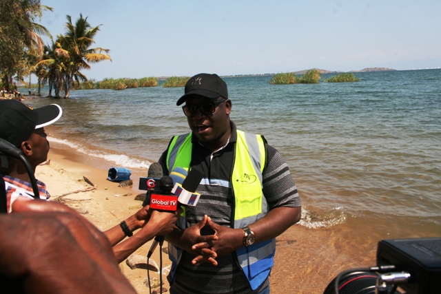 Mkuu wa Wilaya ya Nkasi Mkoani Rukwa Mh. Asid Mtanda akizungumza na waandishi wa habari katika Bandari Bubu ya Kirando ziwa Tanganyika wakati alipofanya ziara na Meneja wa Bandari (TPA) Kigoma ziwa Tanganyika Ajuaye Kheri Msese katika bandari bubu hiyo.