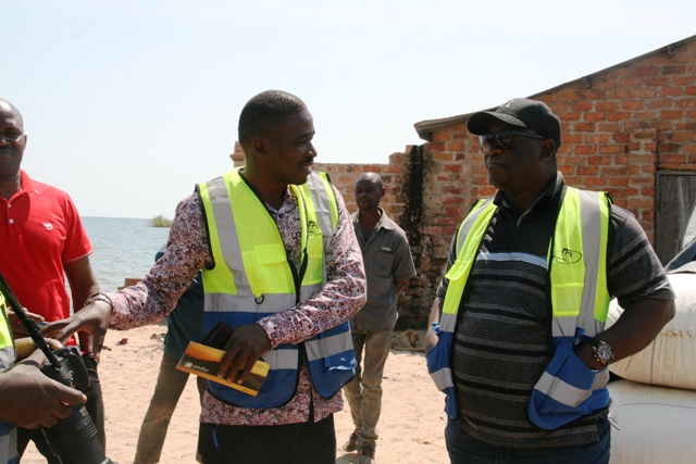 Mkuu wa Wilaya ya Nkasi Mkoani Rukwa Mh. Asid Mtanda akizungumza na Meneja wa Bandari (TPA) Kigoma ziwa Tanganyika Ajuaye Kheri Msese katika bandari bubu hiyo.