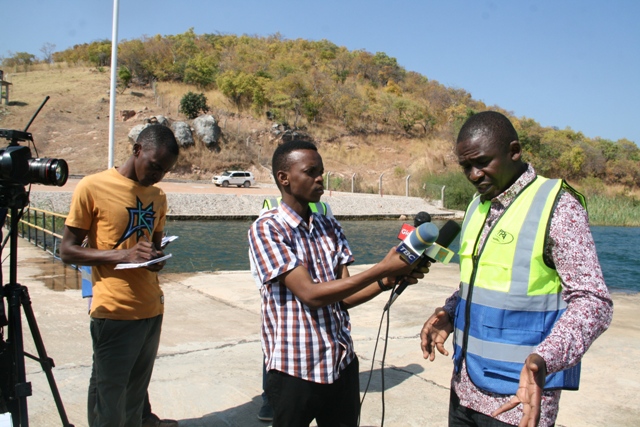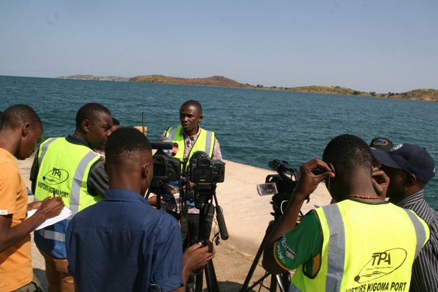 Meneja wa Bandari (TPA) Kigoma ziwa Tanganyika Ajuaye Kheri Msese akiwaelezea waandishi wa habari kuhusu ujenzi wa bandari hiyo uliokamilika kwa asilimia 100.
