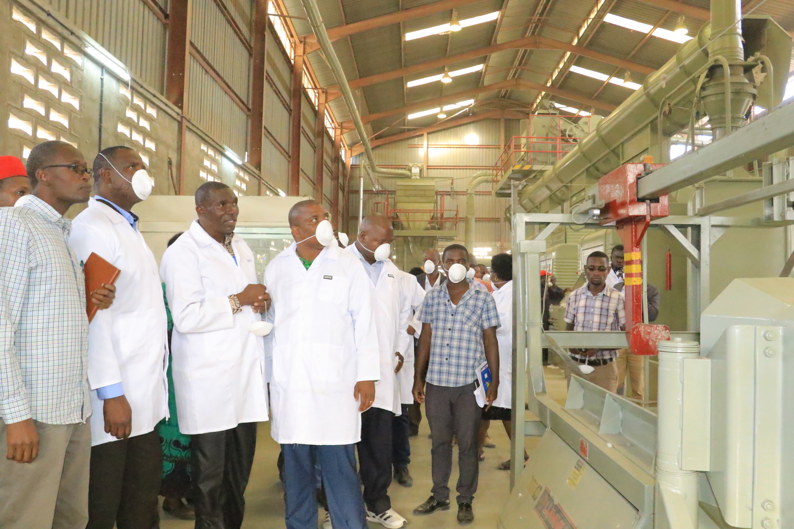 Mkurugenzi wa Kiwanda cha NGS kilichopo Majahida Bariadi ambaye pia ni Mbunge wa Itilima, Mhe. Njalu Silanga(wa tatu kulia) akitoa maelezo kwa Waziri wa Kilimo, Mhe. Japhet Hasunga (wa tatu kulia), na viongozi wengine wa Mkoa wa Simiyu wakati wa ziara ya Waziri huyo mkoani Simiyu Juni 15, 2019.