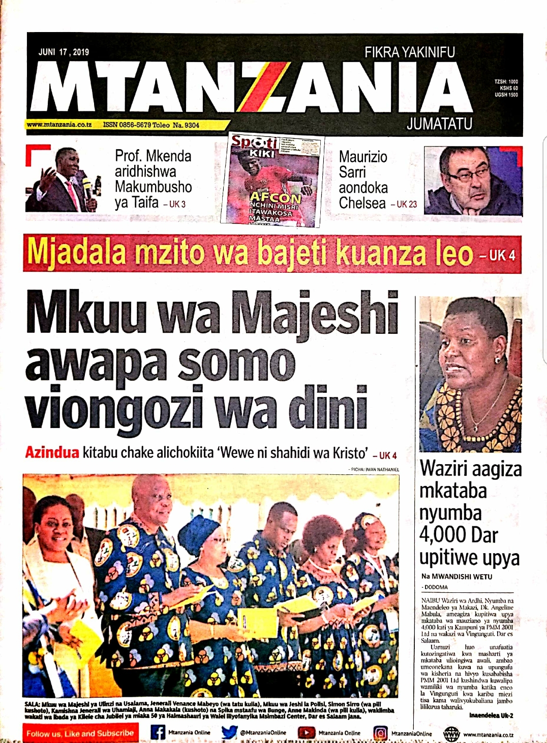 MagazetiPITIA VICHWA VYA HABARI KATIKA MAGAZETI YA LEO JUMATATU JUNI 17,2019 Last updated: 2019/06/17 at 3:45 AM Alex Sonna 6 years ago Share SHARE Alex Sonna June 17, 2019 June 17, 2019 Share this Article Facebook Twitter Email Print Previous Article KIWOHEDE, AGAPE WAUNGANA NA SERIKALI YA MKOA WA SHINYANGA KUADHIMISHA SIKU YA MTOTO WA AFRIKA Next Article NGOMA AFRICA BAND TO ROCK 9th INTERNATIONAL AFRICAN FESTIVAL TUBINGEN,GERMANY 2019
