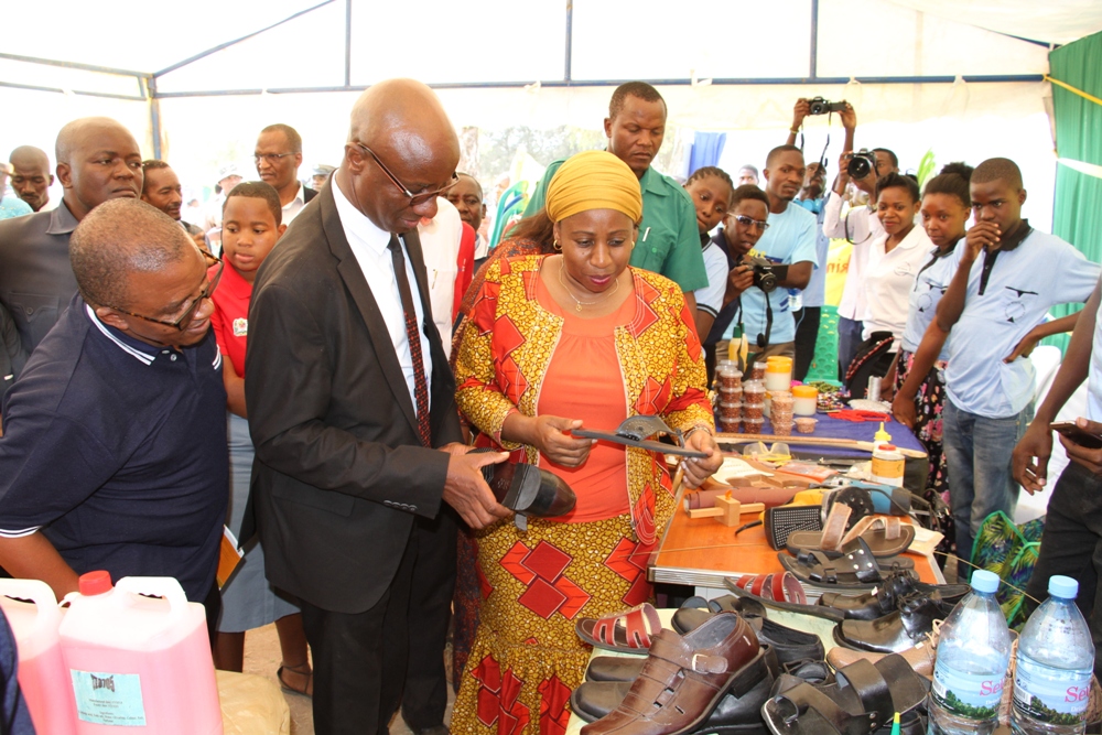 Waziri wa Afya, Maendeleo ya Jamii, Jinsia, Wazee na Watoto Ummy Mwalimu pamoja na Mkuu wa Mkoa wa Geita Muhandisi Robert Gabriel wakiangalia viatu vya katika banda la Kikundi cha Vijana Cluster cha Shirati Rolya Mkoani Mara wakati wa kilele cha Maadhimisho ya Siku ya Mtoto wa Afrika leo katika viwanja vya Shule ya Msingi Mkapa iliyo katika mji mdogo wa Katoro Mkoani Geita.